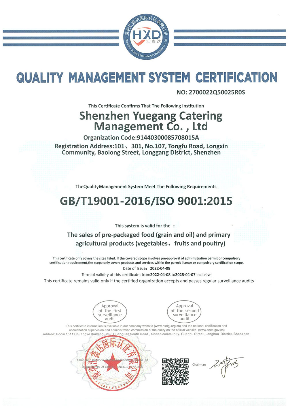 深圳市粵崗餐飲管理有限公司,是一家集蔬菜種植和農副產品配送為一體的專業型餐飲公司,主要為學校、工廠企事業機關單位提供蔬菜和農副產品配送服務。公司自成立以來始終以質優價廉、服務至上為原則,嚴格按照ISO:9001國際標準體系進行管理。同時建立了行業領先的配送中心、大型冷庫和保鮮庫、檢測中心以及專業化的配送團隊,能長期安全、穩定、準時的配送貨物。我們所有蔬菜均經過初步加工、無黃葉,無泥沙等雜質,利用率達97%以上...保障向用戶提供的各類食材的衛生和質量。公司為了適應不同客戶的需求,配有專業人員和配送車輛,實行“一對一”的服務體制,一心一意的為客戶服務,秉承粵崗誠實守信、服務第一、客戶至上的服務標準,真正讓客戶花最少的錢吃最好的菜?;泹彾嗄陙砗我孕佬老驑s,因為我們知道只有勇于擔當責任,才能承擔更大的責任,就是因為 粵崗員工貫徹公司態度決定一切、細節決定成敗的真理,從質量抓起,從服務做起,才創造了如今的規?;⒔y一性配送、專業化服務的粵崗。